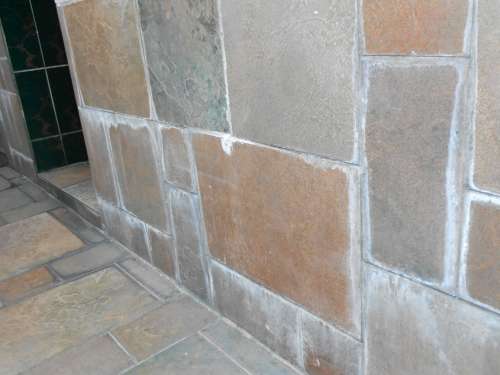 水泥與砂相結合、在做基礎時裡面.2500磅的水泥砂未乾固.裡面的水氣隨著縫隙排出去時.遇空氣即形成白色粉沫.用酸性洗劑或鋼刷做清潔過即可慢慢改善了。